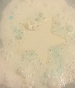 It starts by producing loads of white fluffy foam across the surface of the bath and then the star starts to spin round and round as it oozes lovely blue colour wich creates the most beautiful pattern on the surface of the water. I love how it always keeps a star shape as it spins across the top of the bath and then it reaches it prestige and loads of multi coloured little stars come spilling out and across the bath water.