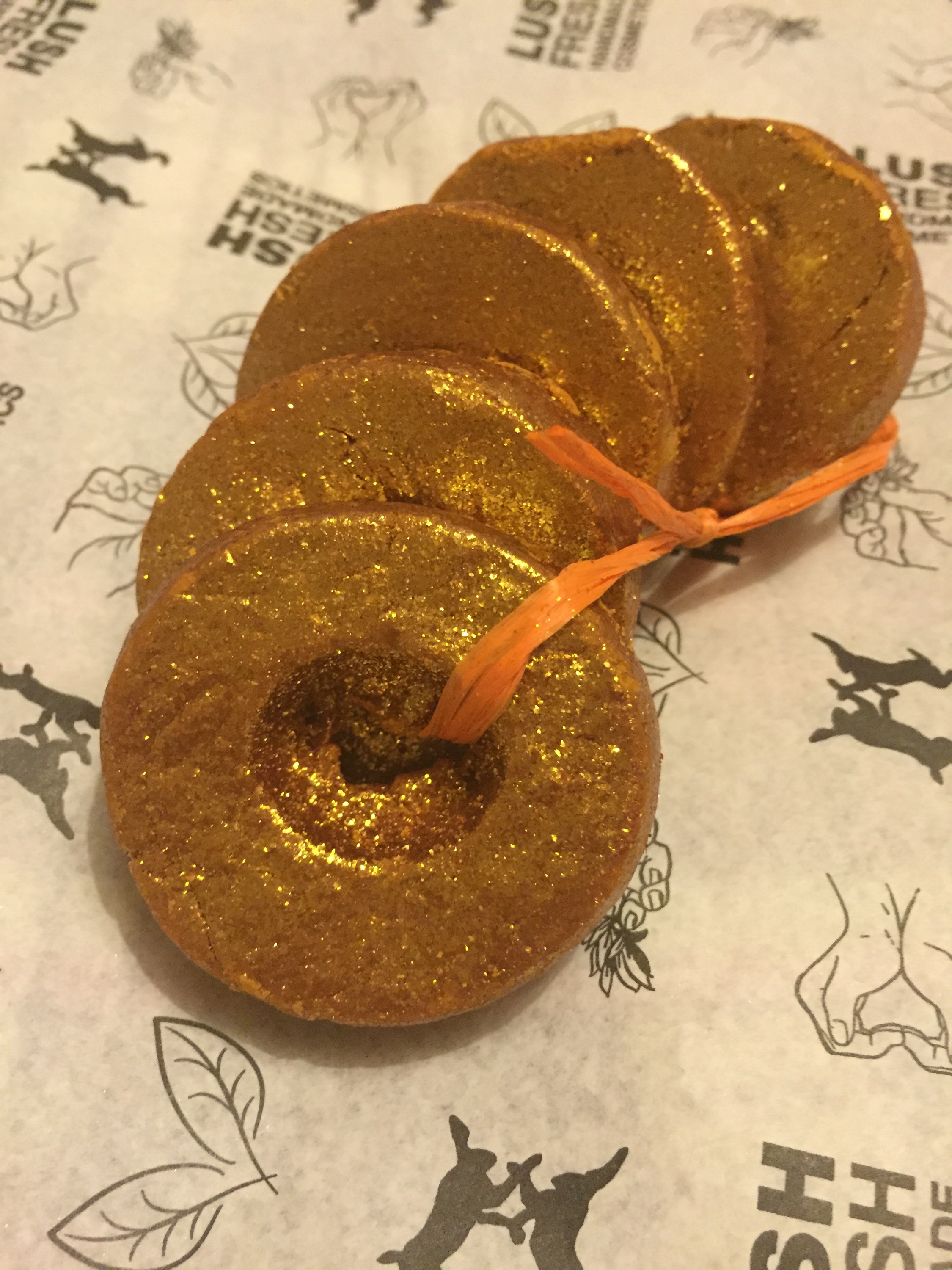 To me the five gold rings bubble bar is such a Christmassy product. I looks like it should be hung on a Christmas tree and not used in the bath. Featuring five elegent gold rings covered in glitter and all joined together with a peice of gold string. This is one very beautiful bubble bar , wonderfully named after the much love Christmas song “on the first day of Christmas”.