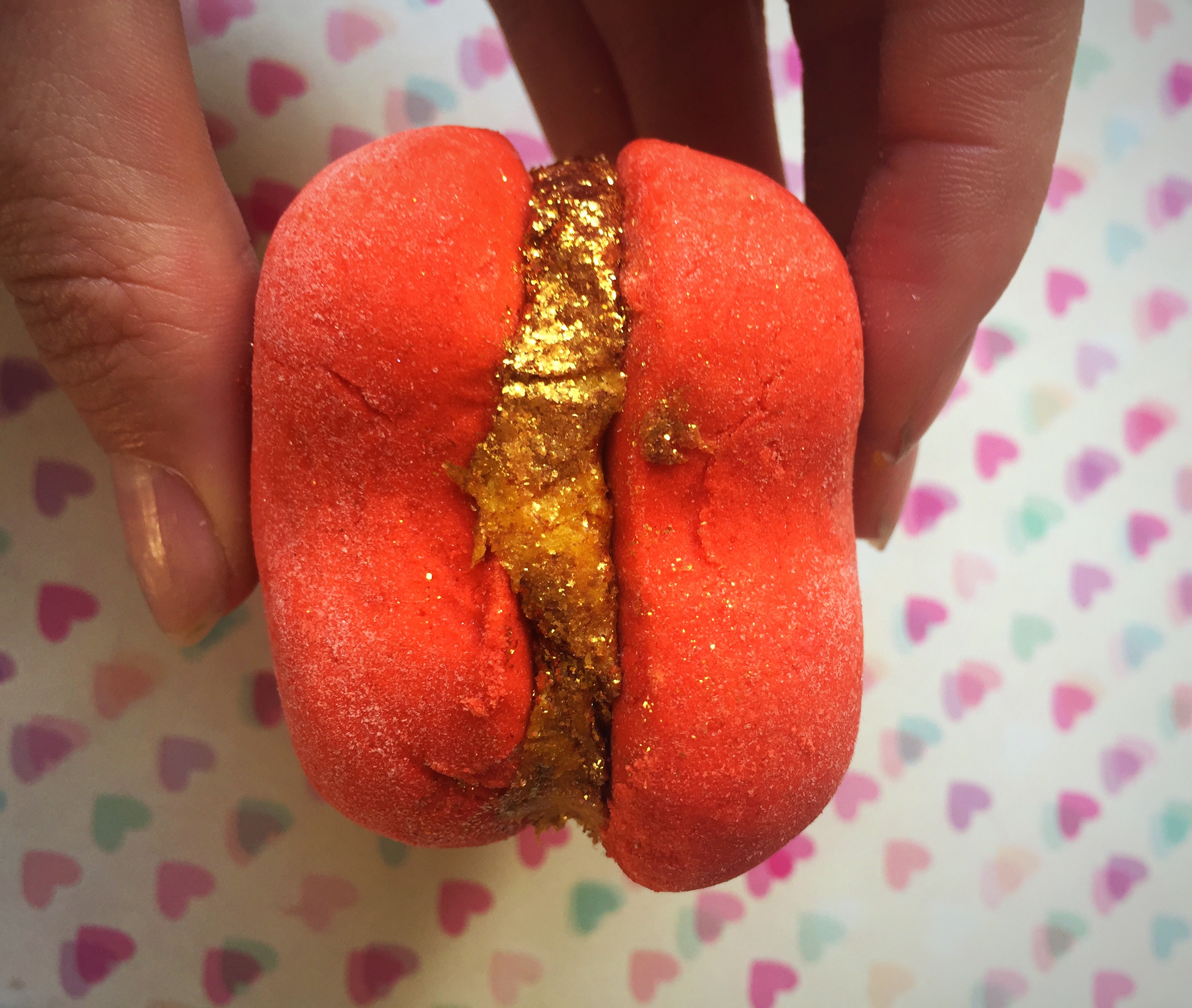What I like most about a bubbleroon is that it is a very moisturing product. Bubbleroons are basically two small bubble bars sandwiches together with a good helping of Shea butter (almost like a little cake). It is this element of Shea butter that adds the wonderfully moisturing quality to the product. What is extra special about the Heart Throb bubbleroon is that the Shea butter is covered in lots and lots of super sparkly gold glitter.