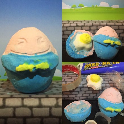 When it comes to novelty and fun products, the Humpty Dumpty bath bomb defiantly pulls out all the stops. Inspired by the classic nursery rhyme, this gigantic bath bomb is not only perfect to be part of a Easter range but also brings out your inner child. The Humpty Dumpty bath bomb is very large compared to your average sized bath bomb. Shaped like an egg and decorated to look just how I imagine Humpty Dumpty to look like.