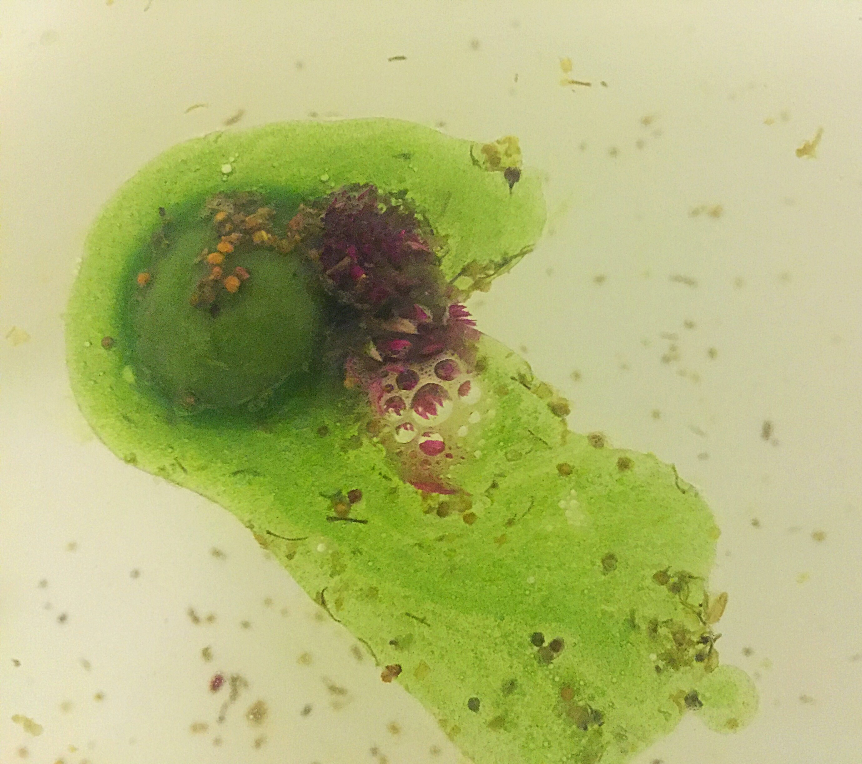 Once popped into water, this bath oil slowly starts to dissolved and melt. It creates little droplets of oil across the surface of the water, as its array of essential oil and butters melt. I have found that the temperature of the water makes quite a difference with how quick this product melts. I quite like to use it in fairly hot water as I find the scent really evolves with the steam of the water.