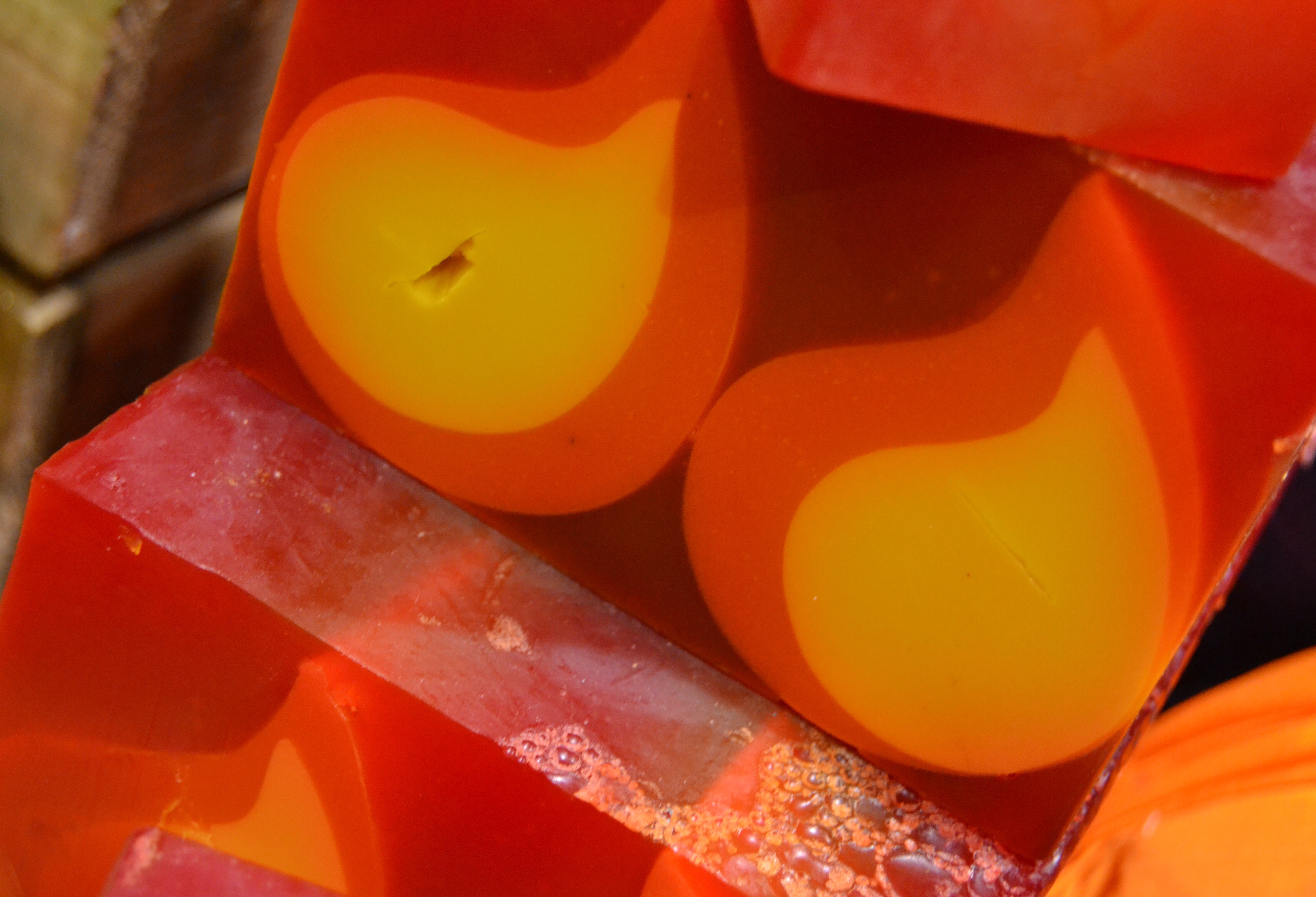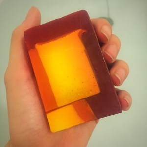 The yellow and orange flame in the soap contain chestnut oil and the red parts of the soap contain dried chestnut. This gives the soap an anti inflammatory affect. The clove bud oil also help to create an stimulating effect and is an antiseptic making this soap super affective as well as super pretty.
