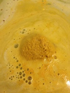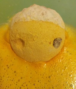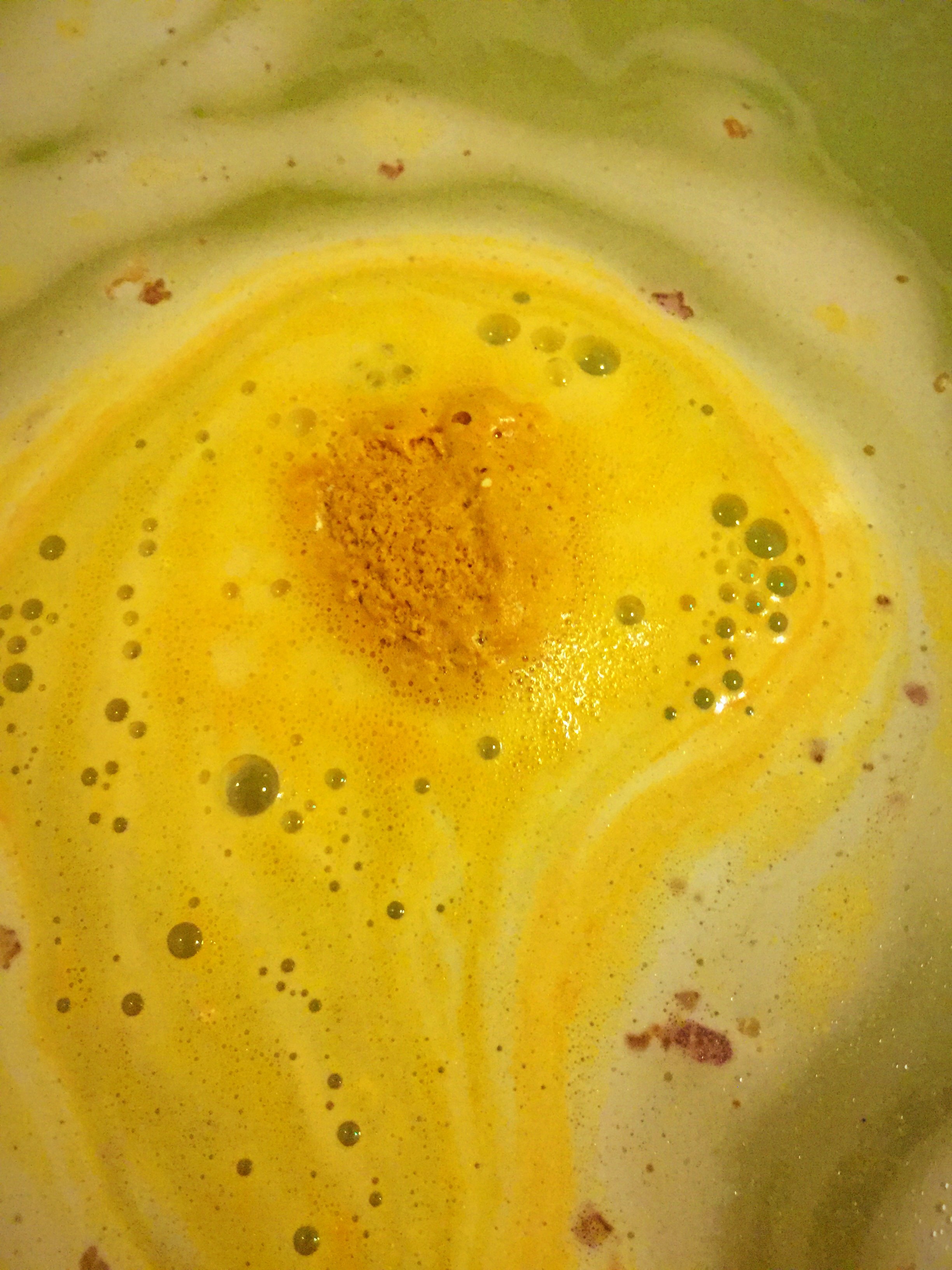 Inside the bath bomb is a very good helping of cocoa butter. As the bath bomb dissolves the butter melts leaving droplets of oil across the surface of the water. This element makes this Bombardino very similar to the butterball bath bomb. I found the inclusion of the butter made this it extremely moisttuiding. After use I found my skin super soft and I didn’t need to use any lotion at all.