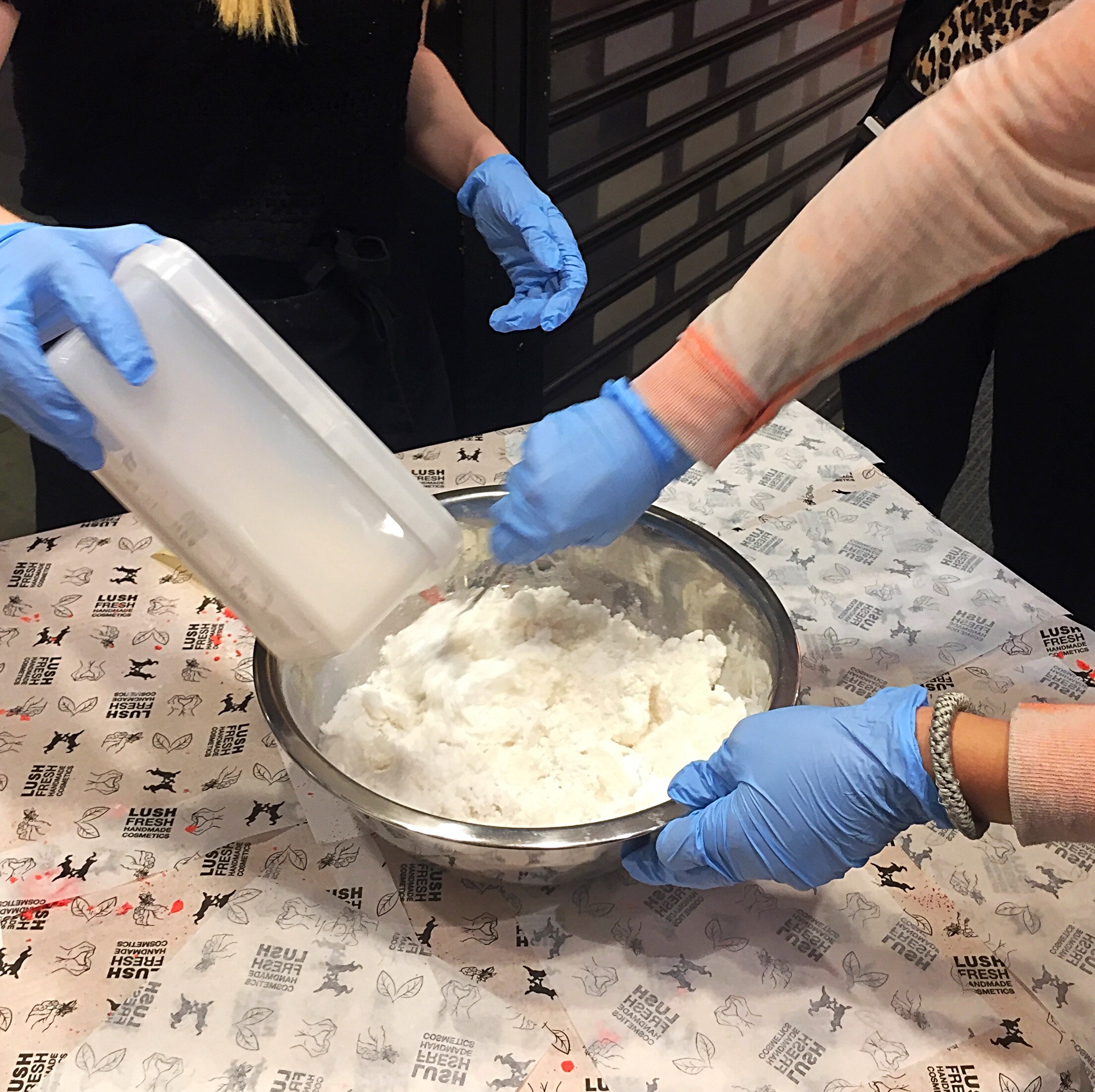 We started off making our bubble bar by mixing all of the ingredients together. Lush spend a lot of time sourcing their ingredients to make sure they are all completely natural and ethically sourced. All of the ingredients used are also as very fresh and once the product is made is shipped straight to store to give you the freshest products possible.