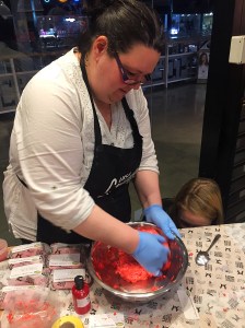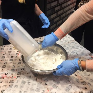 Once all of the ingredients had been mixed together including bubble agents, scents and colouring the mixture was mixed and mixed until it form a dough like consistency. It’s safe to say that making a bubble bar is very much like baking a cake. Once all the ingredients where combined together we each took a portion on the mix and threw it from hand to hand until the mixture had firmed up.