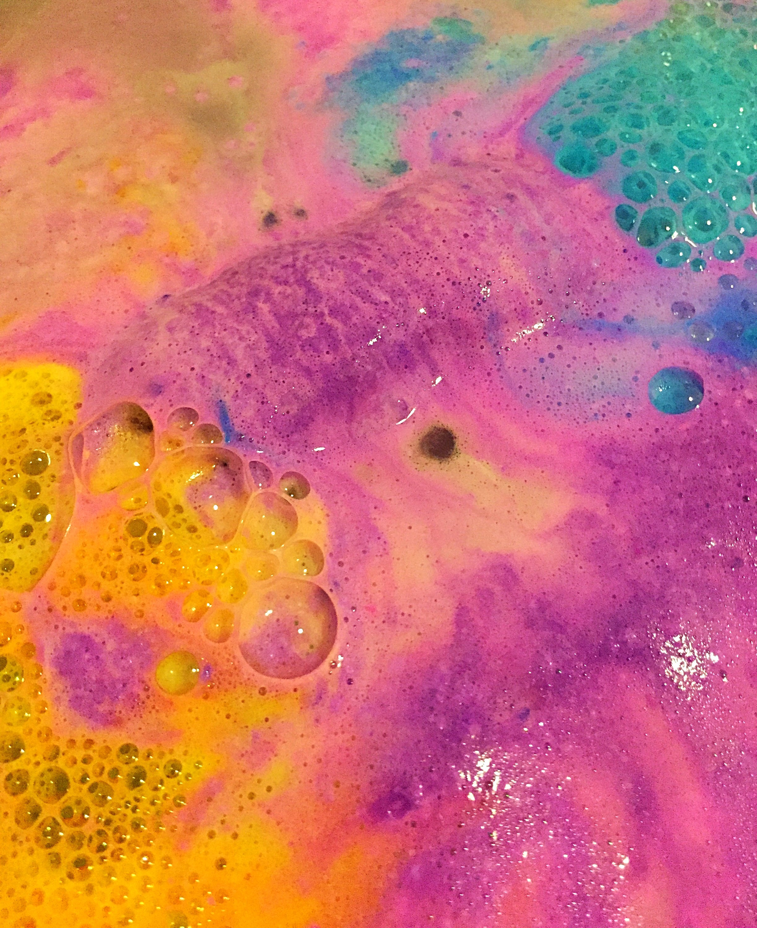 I was very excited about retrying the Northern Lights Bath Bomb to see if it was just as spectacular as its old design. Once in the water this is when the magic really happens. If you like a bit of bath art you will love this bath bomb. As soon as it hits the water it creates an array of purples blues and yellows across the surface of the water creating super pretty swirls of colour.