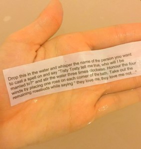 The original version of the bath bomb turns the water a milky white colour, where the Valentine’s specials turns the water a pretty milky pale pink (I defiantly prefer the pink version). As the bath bomb dissolves the rose buds float across the surface of the water which adds a lovely romantic touch ( don’t worry they are very easy to pick out the water) and in the Valentine’s Day special your love potion is released which you can read aloud to create your own love spell (a wonderful Valentine’s Day touch).