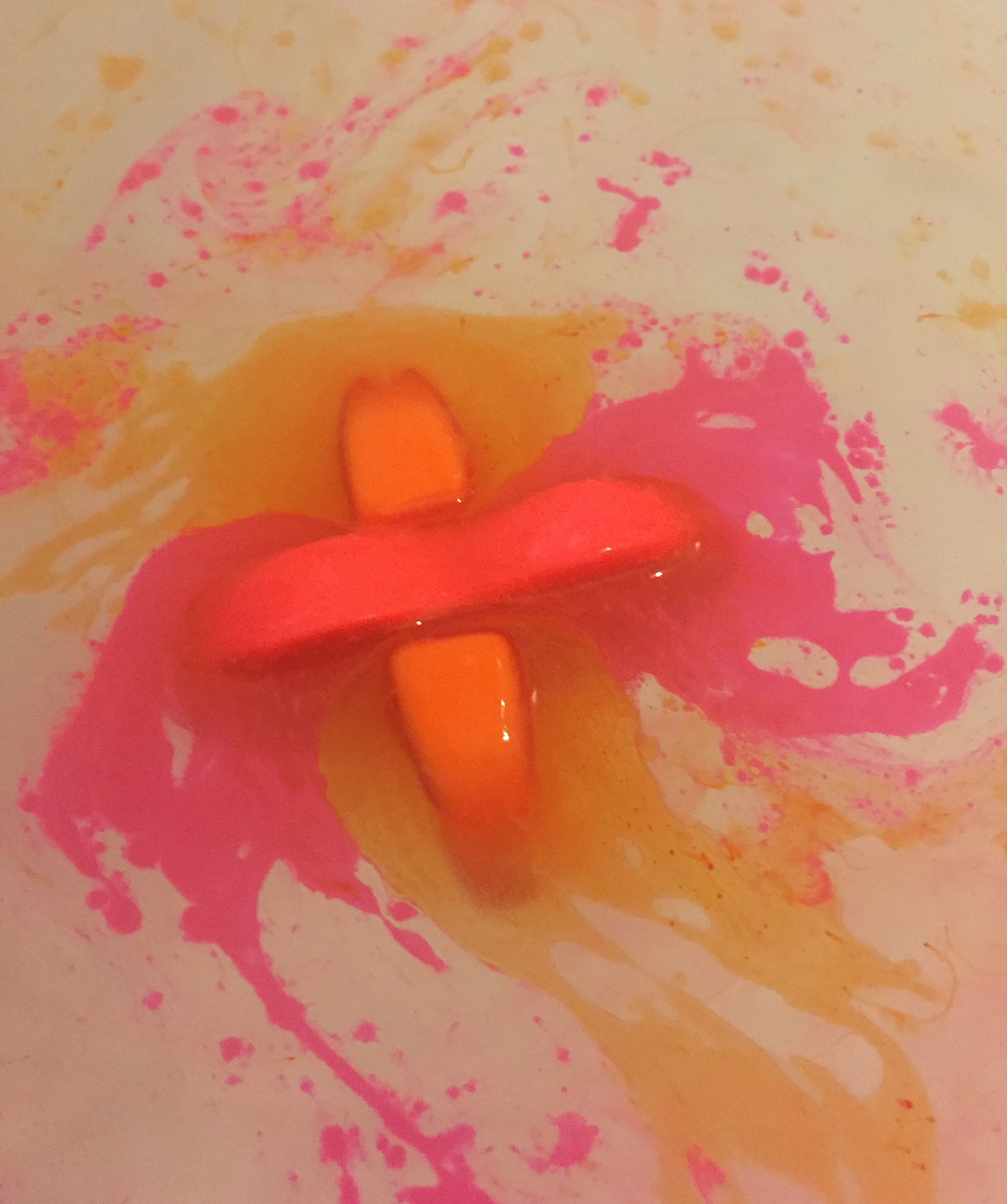Once popped in the water the bath melt floats across the surface of the water. As it slowely melts beautiful coral and magenta colours swirl across the surface of the water to created a stunning picture. Once swirled into the water the oils turn the water a beautiful pinky orange. The inclusion of cocoa butter and Almond oil makes this product very conditioning for the skin. The oils and butters add lots of moisture to the skin and leave the water feeling very Luxurious.