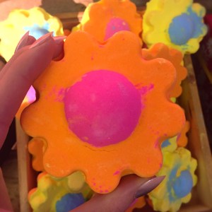 The Ups-A-Daisy bath bomb is a very brightly coloured product. In the shape of a large daisy one side is coloured yellow with a blue centre and the other side is coloured orange with a pink centre. Making it a lovely uplifting and cheerful product.