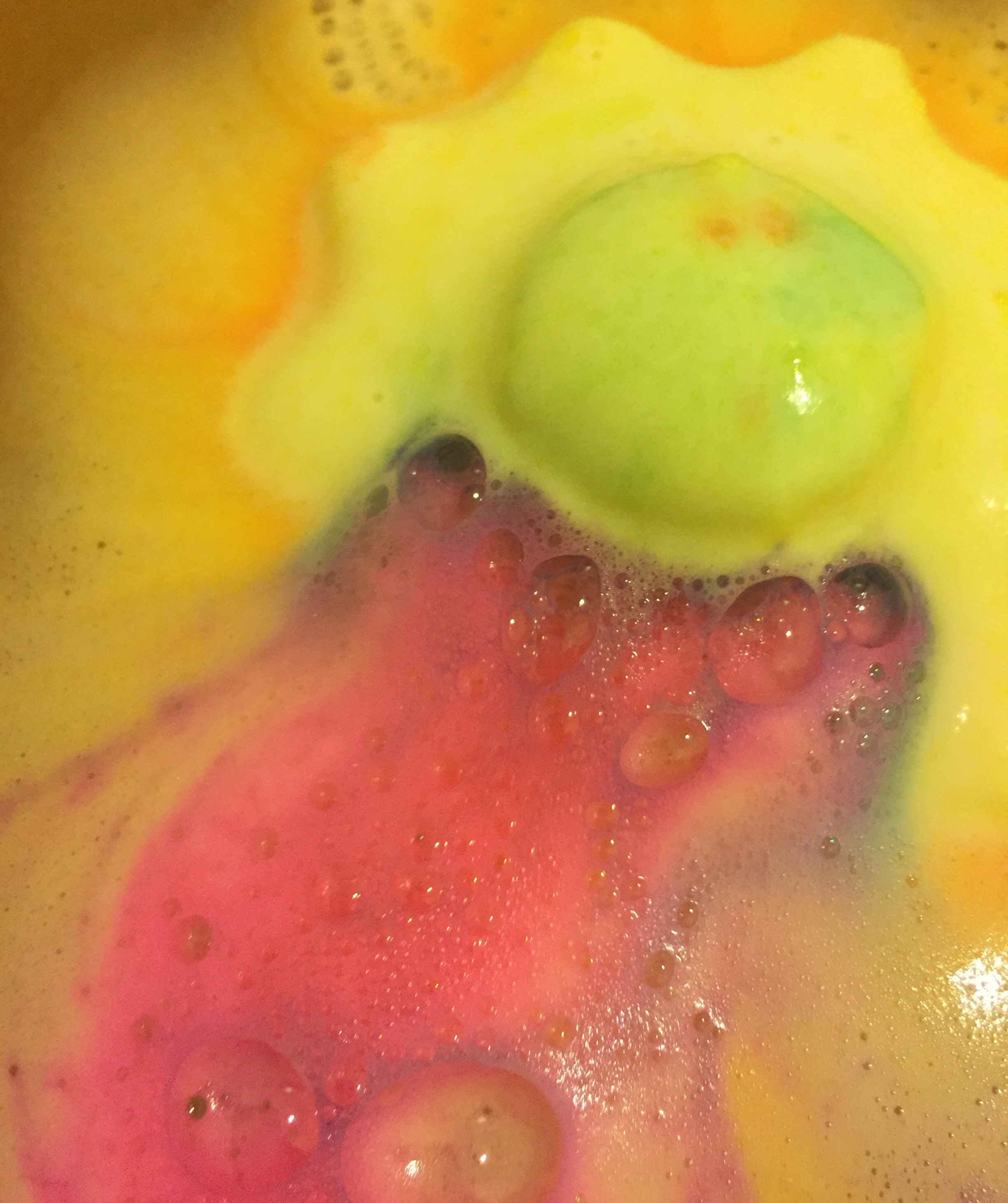 Once popped in the water the Ups-A-Daisy bath bomb is a very slow fizzer. As it slowly dissolves it creates a mountain of bright coloured foam which swirls across the surface of the water to create beautiful rainbow coloured display. Once the centre of the bath bomb is reached a very fast fizzing blue and pink colour is released adding to the already colourful display.