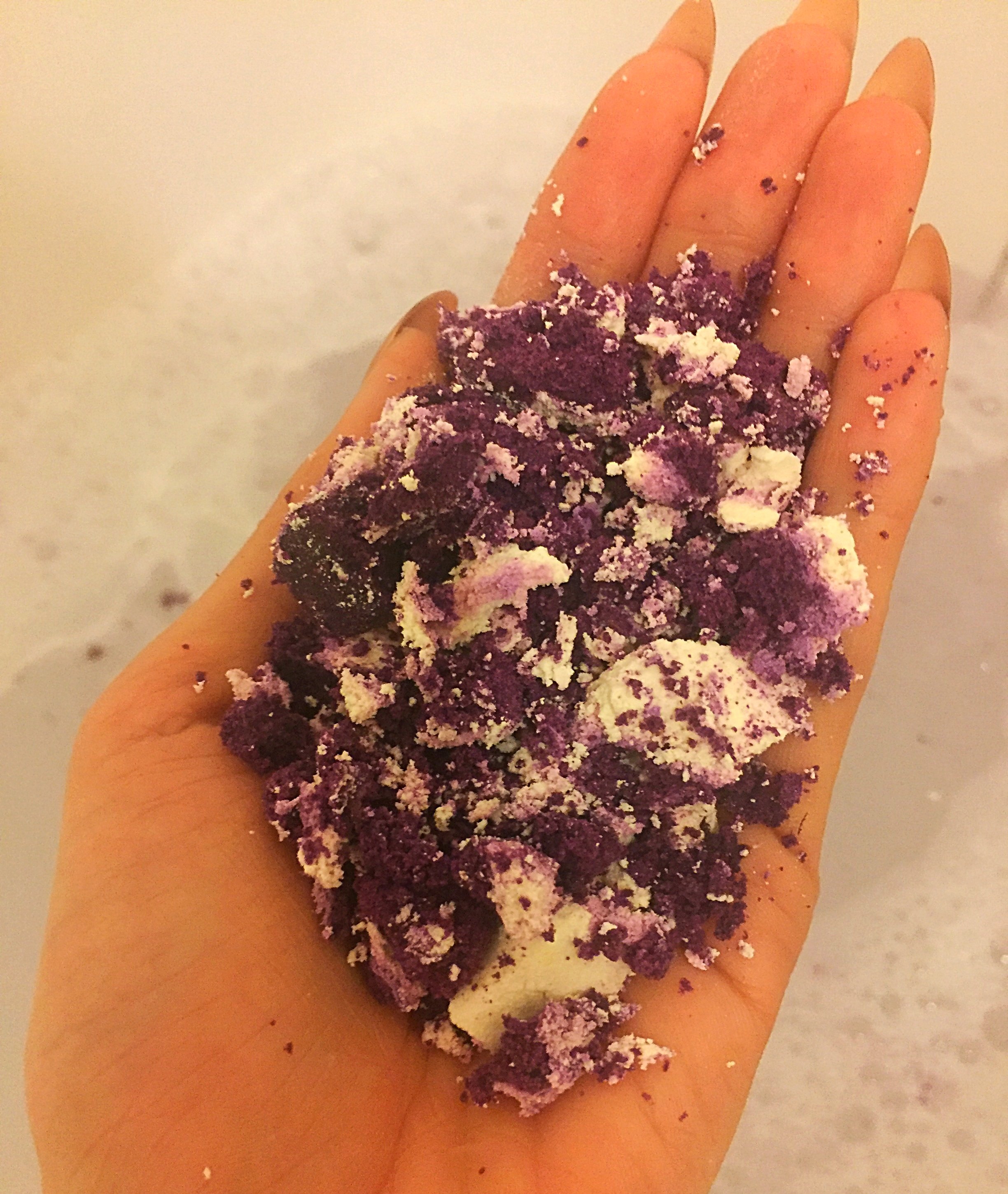 INGREDIENTS: Sodium bicarbonate, cream of tartar, sodium Laureth sulfate, lauryl betaine, cornflour, perfume, bergamot oil, Clove bud oil, jasmine absolute, rose absolute, violet leaf absolute, ylang ylang oil, lavender powder, soya milk, alpha-isomethyl ionone, eugenol, linonene, linalool, colour 17200, colour 42090