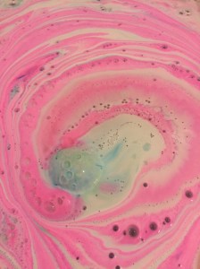 The Mother Earth bath bomb keeps spinning in the water spreading more and more colour across the surface of the water. As the bath bomb reaches its centre lashings of pink coloured are released from the centre adding to the bath art that had been created. The pink colour also changed the water to a deep purple colour with a slight shimmer of lustre.