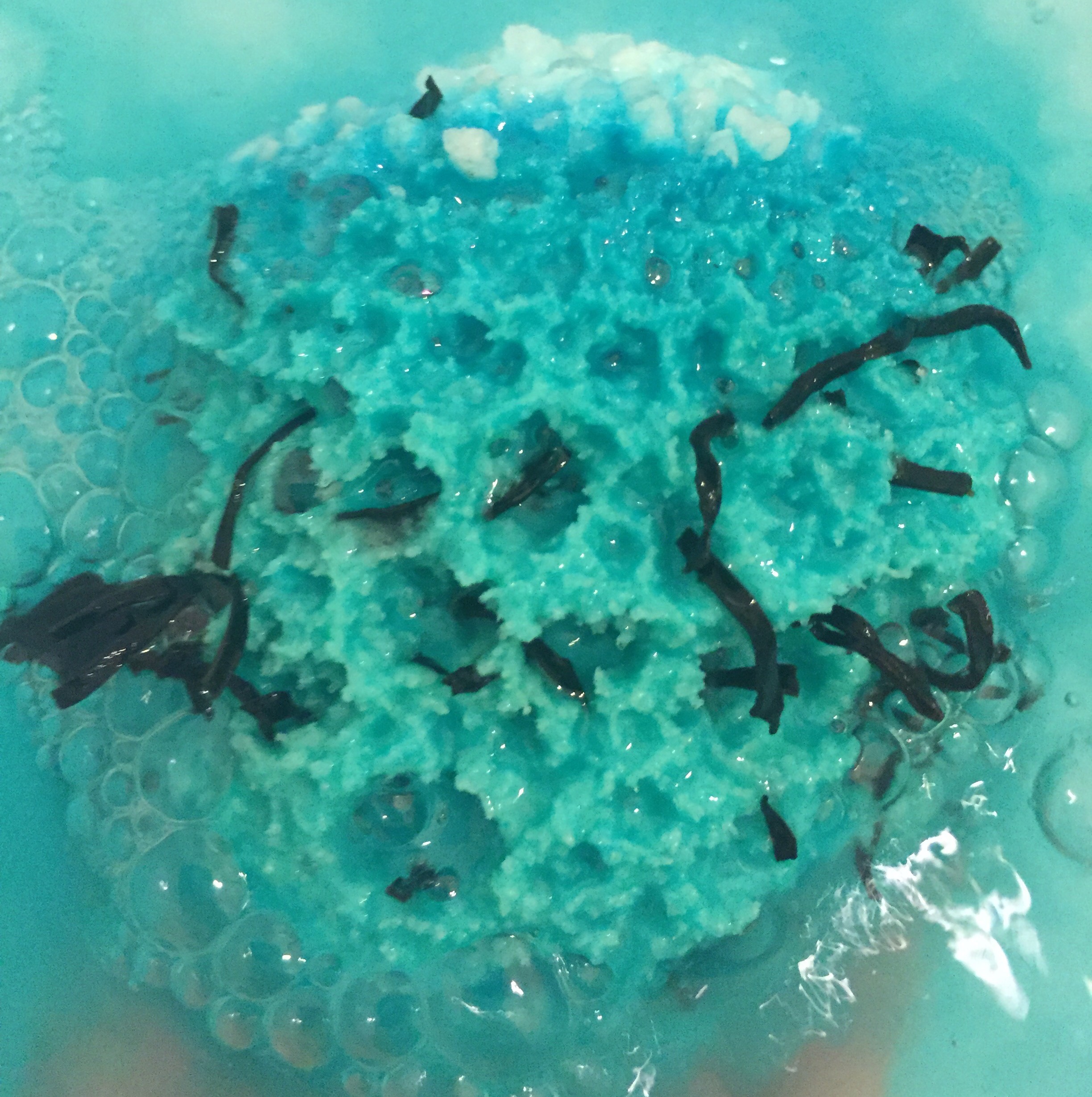 Once in the water the Big Blue bath bomb is a fairly quick fizzer. This fast fizzing action is great to help sooth sore muscles. As the bath bomb dissolves the water turns a beautiful vivid blue colour and the seaweed swirls around the water making you feel like to have your own mermaid lagoon.