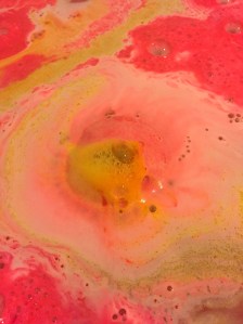 Once in the water the Christmas Sweater is a very slow fizzer, it’s starts by producing large clouds of red foam which float across the surface of the water creating a warming blanket. As it reaches its centre swirls of yellow emerge creating the most pretty patterns in the water. The scent of the Christmas Sweater bath bomb stays nice and strong and I did indeed find that the warming aspect helped to ease all my aches and pain.