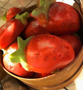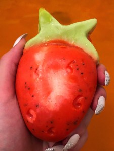 INGREDIENTS: water, propylene glycol, fair trade organic cocoa butter, extra virgin coconut oil, glycerine, organic castor oil, sodium hydroxide, fresh strawberry, perfume, aquafaba, benzoin resinoid, geranium oil, jasmine absolute, silken tofu, cream of tartar, titanium dioxide, xanthan gum, agar agar gel, alpha-isomethyl Ionone, benzyl benzoate, cinnamal, citronellal, linalool, colour 45410, colour 14700, colour 19140, colour 42090