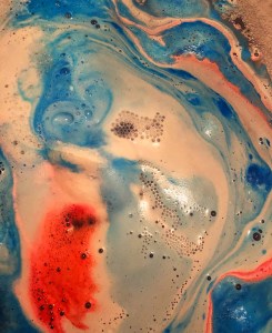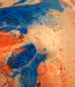 Once in the water this is where the jingle bells bath bomb really shows it’s true colours, As it bobs around at the surface of the water it releases waves of white foam, until it meets its middle this is where the bath bomb is filled with an array of blue salt crystals. Bright colours of blue and pink are added to the swirls or white creating a rather spectacular display.